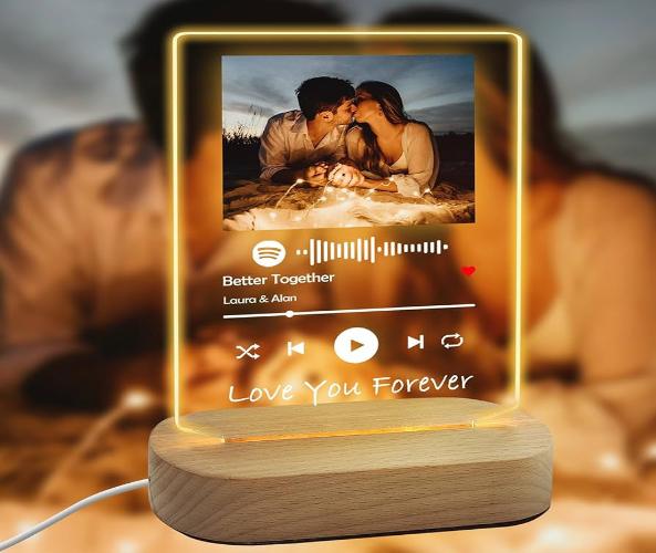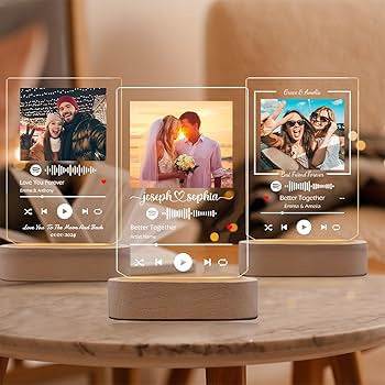 Custom Spotify Acrylic Frame: A customized photo frame featuring your favorite song with a scannable Spotify code and a cherished photo. The acrylic plaque is elegantly mounted on a sturdy wooden base, creating a stylish and modern decor piece. The combination of photo and song makes it a sentimental gift for special occasions like anniversaries, birthdays, or memorable moments. It’s perfect for displaying on a desk, shelf, or nightstand, offering a blend of personalized art and music, all in one beautifully designed frame.